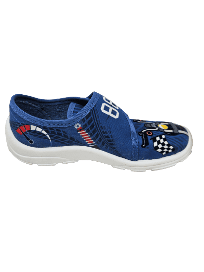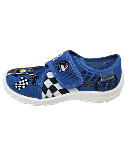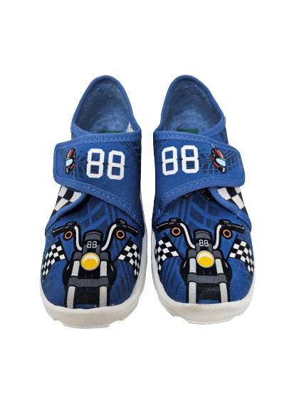 Wie cool ist der denn? Dieser jeansfarbener Hausschuh punktet mit einem auffälligen Print von Bike- und Ralley Motiven und welches technikbegeisterte Kind kann dazu schon „nein“ sagen? Die betont fetzige Optik wird durch eine reinweiße Laufsohle unterstrichen, so dass dieser Hausschuh eher wie ein Sneaker optisch daher kommt . Damit dürfte er besonders für coole Kids interessant sein.